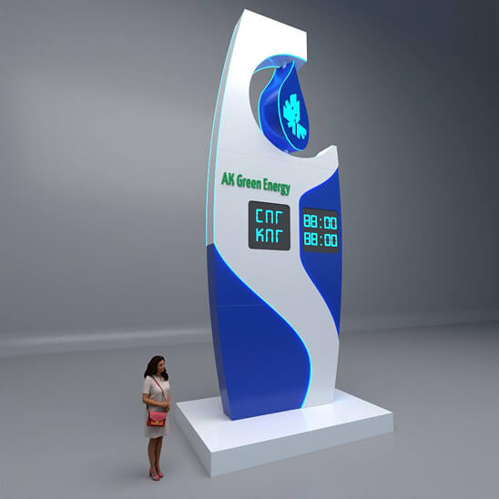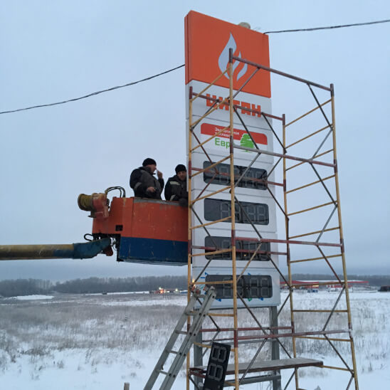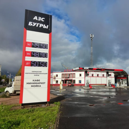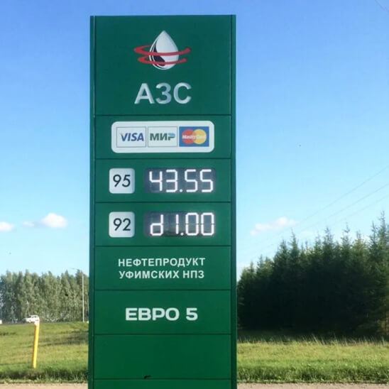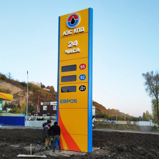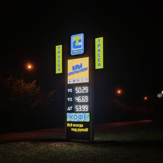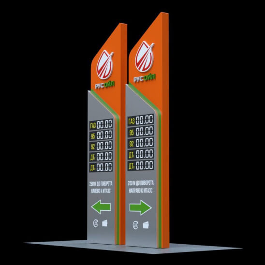 Двустороннее оформление стелы позволяет разместить на ней не только данные о видах бензина и ценах, но и рекламную информацию. Для эффективности в любое время суток стелы имеют светящееся электронное табло с диодными модулями.
